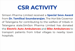 Simson Pharma Ltd. received a Special Seva Award from Dr. Tamilisai Soundararajan The Hon'ble Governor of Telangana for contributing to the welfare of tribals in the state. SimSon Pharma has donated the Electric Auto and Bike ambulances to transport patients from tribal villages to nearby hospital.