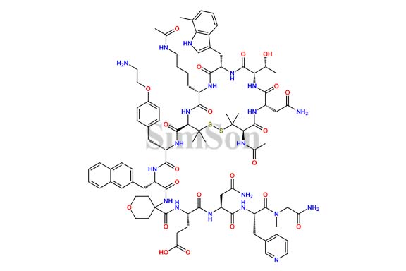 | Chemical Name : | (S)-4-(4-((S)-2-((S)-2-((4R,7S,10S,13S,16S,19R)-19-acetamido-7-(4-acetamidobutyl)-16-(2-amino-2-oxoethyl)-13-((R)-1-hydroxyethyl)-3,3,20,20-tetramethyl-10-((7-methyl-1H-indol-3-yl)methyl)-6,9,12,15,18-pentaoxo-1,2-dithia-5,8,11,14,17-pentaazacycloicosane-4-carboxamido)-3-(4-(2-aminoethoxy)phenyl)propanamido)-3-(naphthalen-2-yl)propanamido)tetrahydro-2H-pyran-4-carboxamido)-5-(((S)-4-amino-1-(((S)-1-((2-amino-2-oxoethyl)(methyl)amino)-1-oxo-3-(pyridin-3-yl)propan-2-yl)amino)-1,4-dioxobutan-2-yl)amino)-5-oxopentanoic acid |