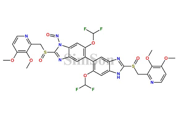| Chemical Name : | 6,6`-bis(difluoromethoxy)-2,2`-bis(((3,4-dimethoxypyridin-2-yl)methyl)sulfinyl)-1-nitroso-1H,1`H-5,5`-bibenzo[d]imidazole |